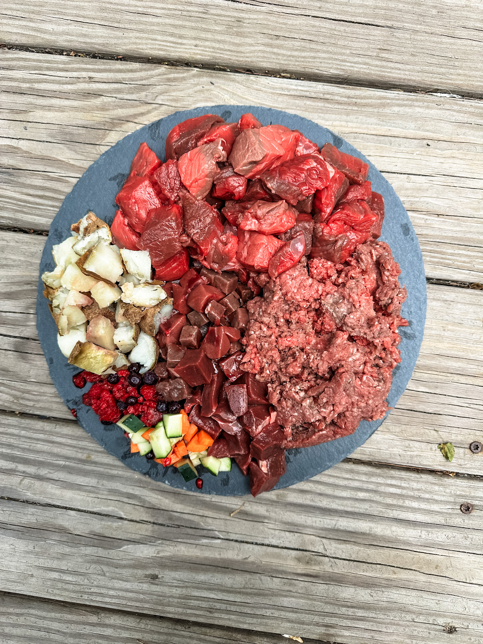 A minimal-ingredient, raw beef and russet potato diet. Balanced to NRC guidelines with added organ meats.