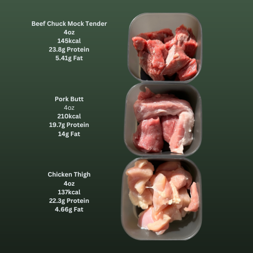 Different cuts of meat contain different fat levels. For example, 90/10 ground beef (90% lean, 10% fat) is very different nutritionally from 70/30 ground beef, which contains far more fat and significantly fewer essential nutrients per gram.